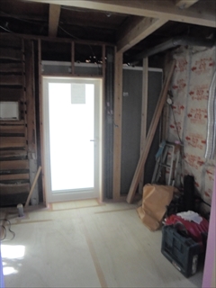 ユニットバスの設置が無事終わり洗面所スペースの床板が貼られました。