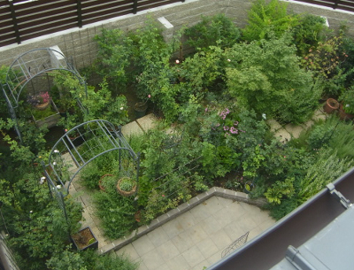 屋根から見下ろした主庭。植物はすべて奥様によるもの。