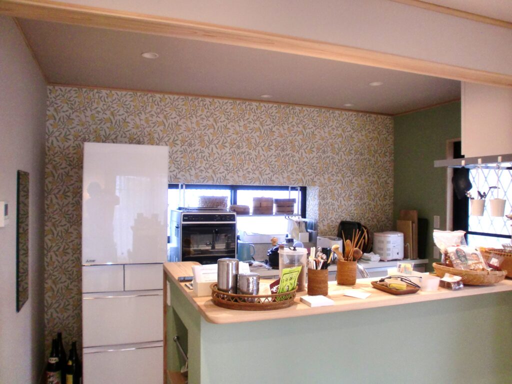 主「工事はリビングダイニングが中心です。床は無垢のスギ板に張り替え、壁と天井はエコクロスを。対面のシステムキッチンにやり替え、カウンターを新たに設置しました。吊戸棚をなくしたことですっきりした空間に仕上がりましたね。キッチンを自分の好きな空間にしたいと思い、一部の壁をウィリアム・モリスの壁紙にしました。キッチンがぱ神戸有数のベッドタウンとして栄える神戸市北区鈴蘭台。中古住宅を購入しリフォームしたHさんにお話を伺いました。