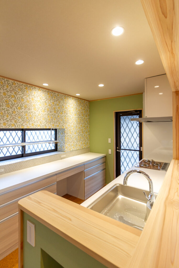 主「工事はリビングダイニングが中心です。床は無垢のスギ板に張り替え、壁と天井はエコクロスを。対面のシステムキッチンにやり替え、カウンターを新たに設置しました。吊戸棚をなくしたことですっきりした空間に仕上がりましたね。キッチンを自分の好きな空間にしたいと思い、一部の壁をウィリアム・モリスの壁紙にしました。キッチンがぱぁっと明るくなり、気に入っています」