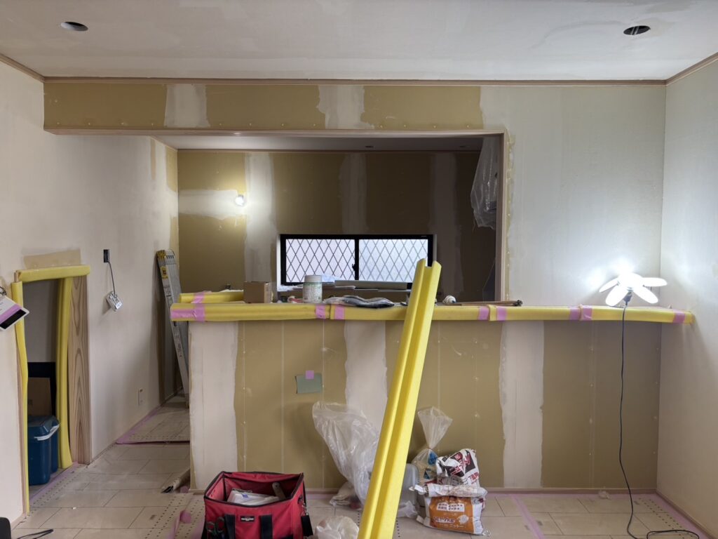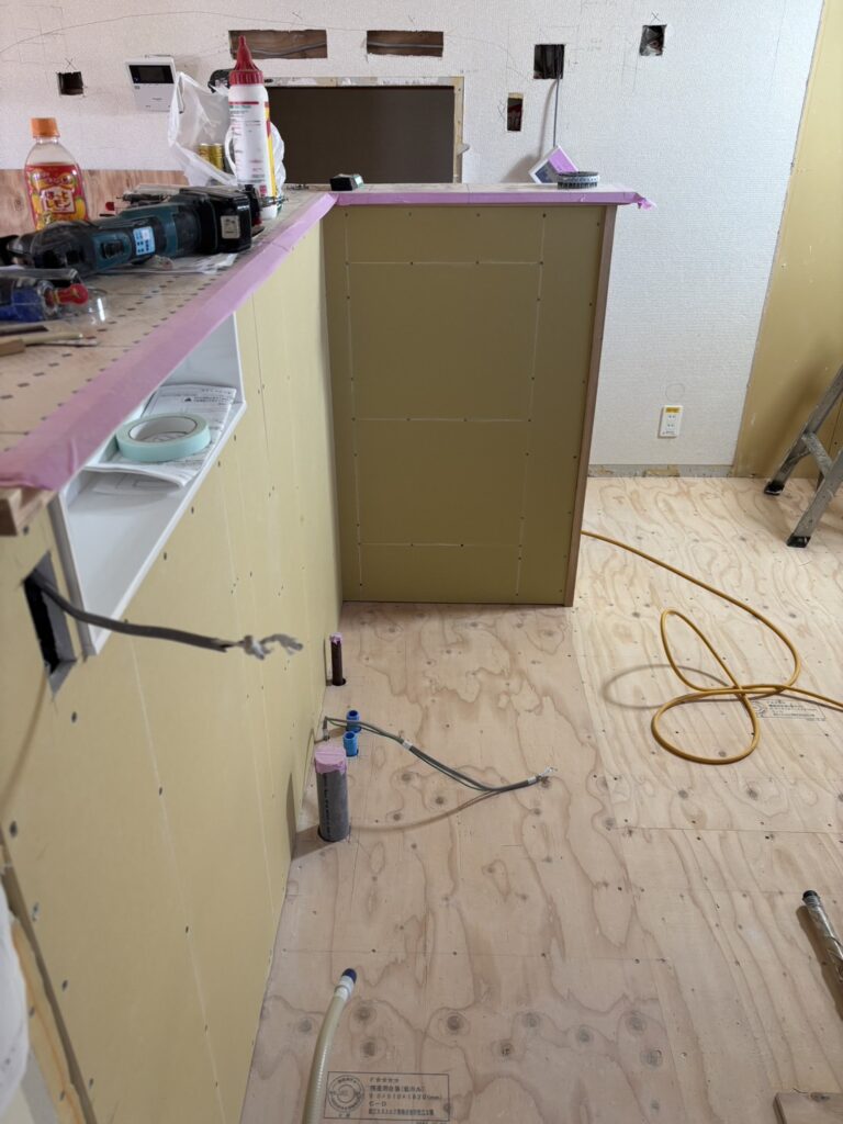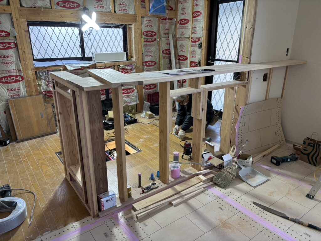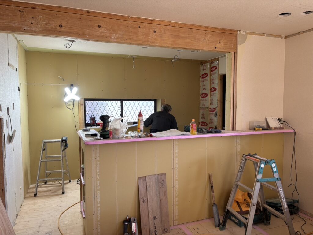 解体が終わって、新たな腰壁カウンターをどんどん作っていきます。