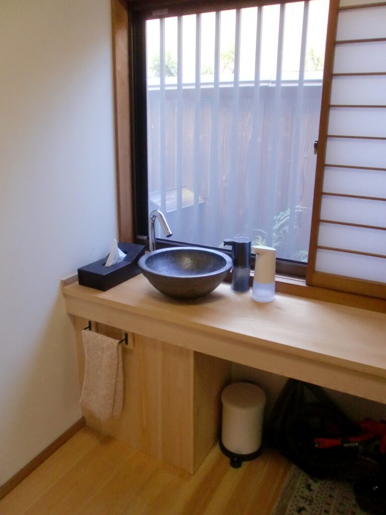 主「日曜大工は趣味程度でしたが、予算の都合上。DIYでやってみようと思い、大工さんには収納家具の枠だけ作っていただくことに。パソコンで図面を設計し、ホームセンターで材料とプロ仕様の道具を揃え、作業に専念。時々大工さんの仕事を拝見しましたが、常に現場が整頓され美しい。さすがプロですね。扉や引き出しがきちんと収まったのは、大工さんが精度の高い仕事をされたからで、本丸があってこそ。引き出しのサイズや取手の素材等は妻の要望も取り入れました。使い勝手について及第点をもらったのでホッとしたかな(笑)これで自信がつき、今回お願いできなかった2階の洗面所と寝室の改装にもチャレンジしたんです。未完成の住まいをライフスタイルに合わせて変えていくのは合理的ですね。これからも家族が気持ちよく暮らしていけるよう、木の住まいを大事に使っていきたいと思います」